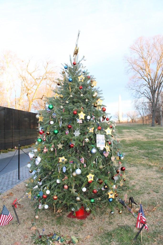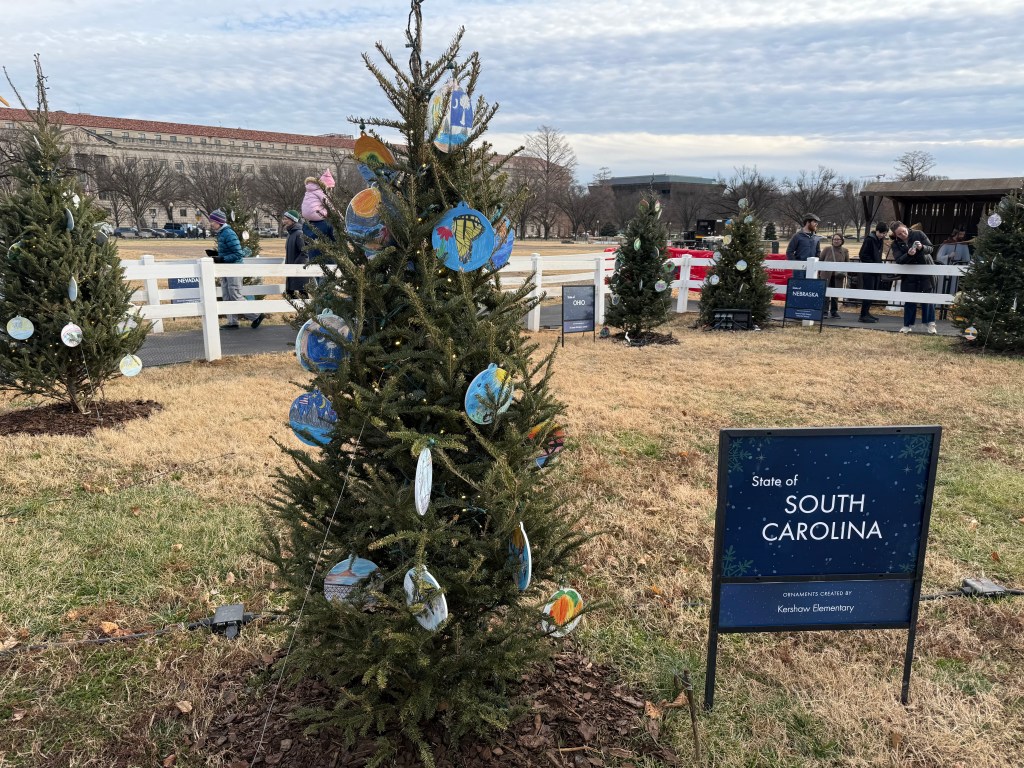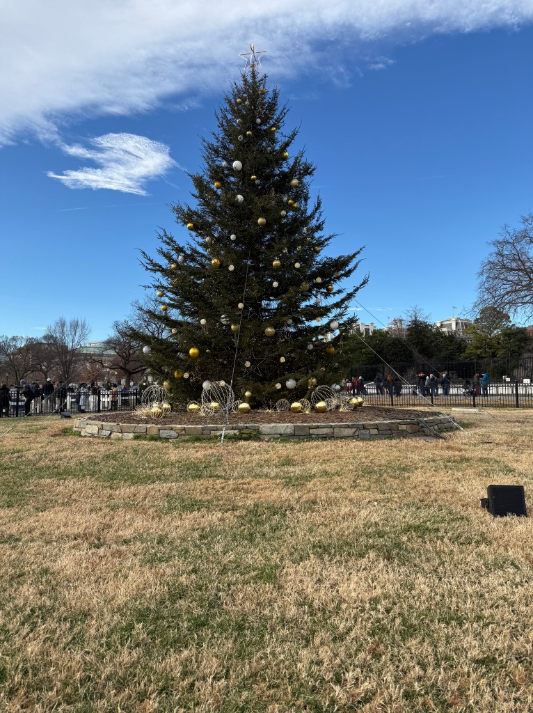 We also swung by the National Christmas Tree near the White House. I’ll admit, it was smaller than I expected (the Rockefeller Christmas Tree may have spoiled me), but I learned that the tree’s variety and height change each year. Seeing it with the White House in the background was special, and I loved the student ornament displays. Each state and region—and even some school systems—had its own tree decorated with ornaments designed by a winning school.